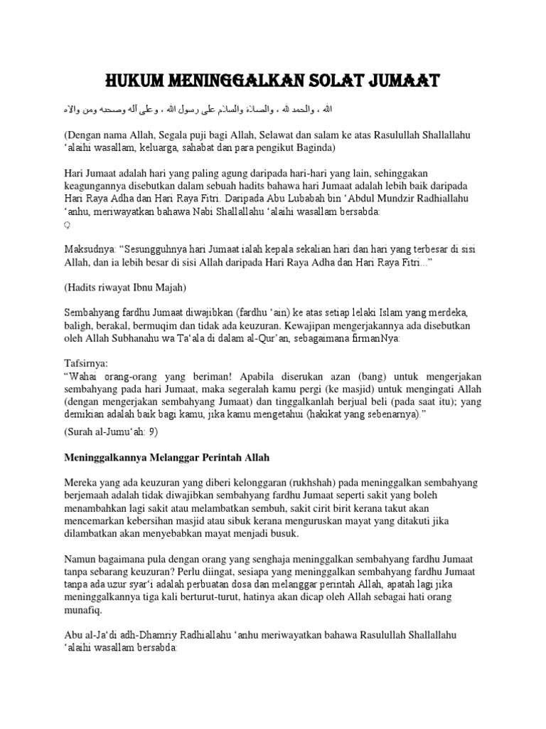 Facebook from lookaside.fbsbx.com Nabi saw diizinkan solat jumaat sebelum berhijrah tetapi tidak berupaya menghimpunkan orang ramai di mekah. Jika seorang laki2 perawat bedah di kamar operasi meninggalkan solat jum'at karena sedang mengikuti operasi pembedahan yang memakan waktu cukup lama, apakah hukum meninggalkan solat jumat berdasar hadist dan quran?? Hukum orang yang meninggalkan shalat jumat sebanyak tiga kali dengan sengaja 186002 tanggal tayang : Meninggalkan solat jumaat merupakan perbuatan yang ditegah kerana solat jumaat hukumnya adalah fardhu ain ke atas setiap individu muslim. 2.solat jumaat ialah solat dua rakaat dalam waktu zohor pada hari jumaat. Solat jumaat itu hukumnya fardu ain. Jika terjadi akad nikah maka nikahnya batal dan isterinya tidak halal baginya. 2.solat jumaat ialah solat dua rakaat dalam waktu zohor pada hari jumaat.